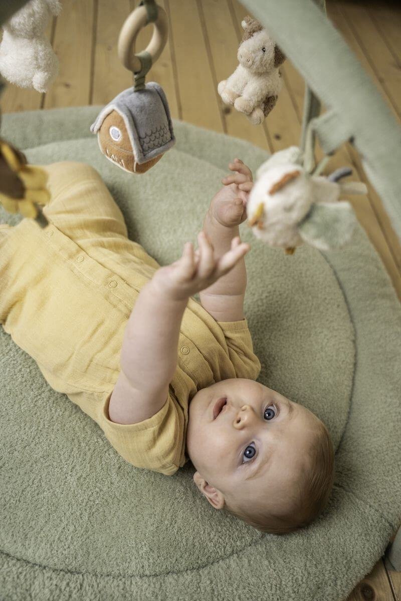 La alfombra es super suave, tiene forma redondeada en la base con un grosor de 2 cm, lo que la hace muy confortable y está inspirada en la estética de la granja de la colección Little Farm, con 5 diferentes suaves juguetes colgantes que mantendrán a su bebé entretenido y desarrollará la coordinación ojo-mano.