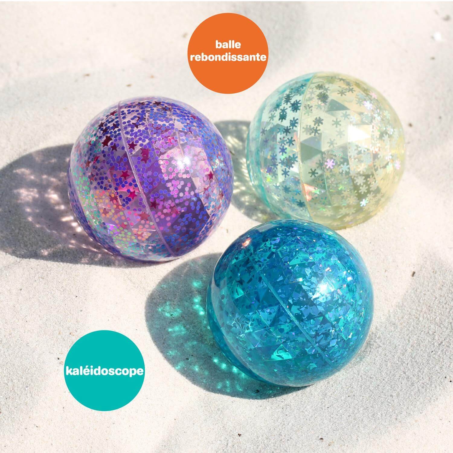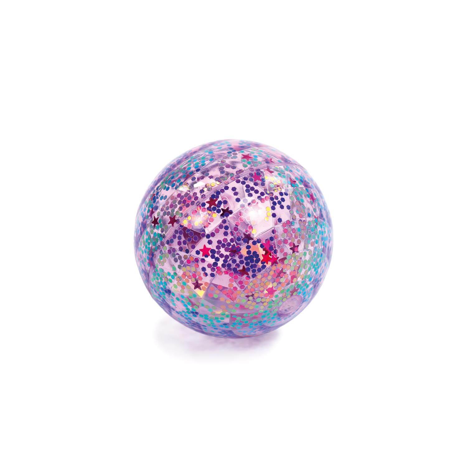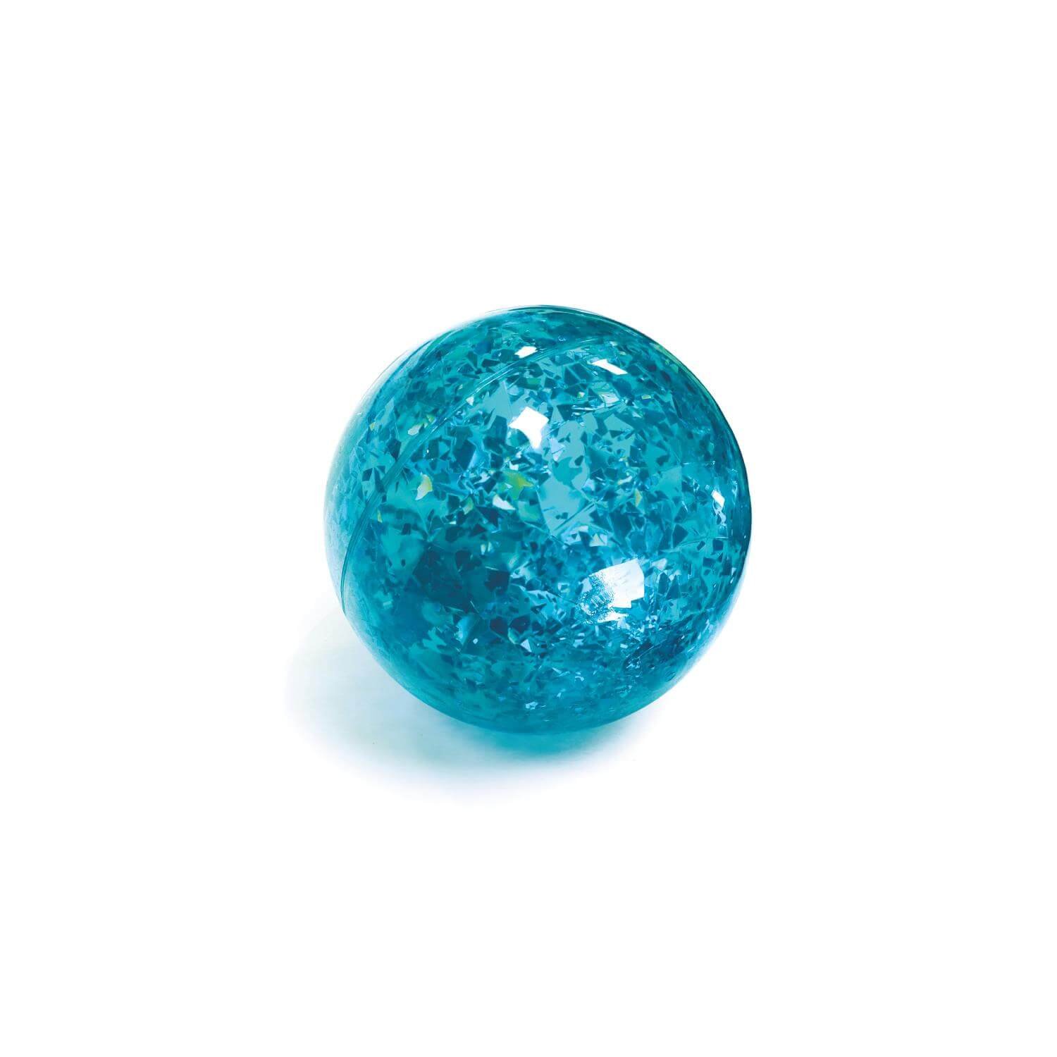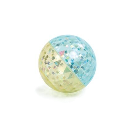 Disponibles en morado, azul y un dúo azul claro/amarillo, estas pelotas son translúcidas y están decoradas con purpurina directamente en la superficie para un efecto visual inmediato y encantador.