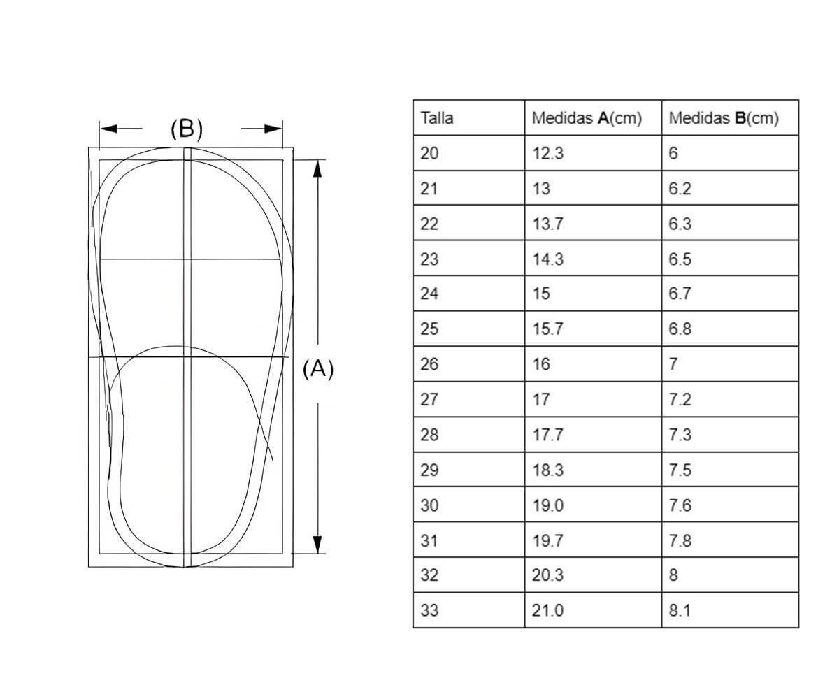 - ATENCIÓN: Las medidas de la tabla corresponden a este modelo en concreto y de la suela interior del zapato. Puedes compararla con la medida del pie de tu peque