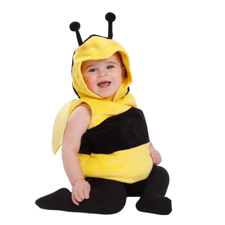 Adorable disfraz de abeja. El artículo viene completo con túnica de burbujas a rayas amarillas y negras y capucha con antenas de abejorro para un efecto completo.
