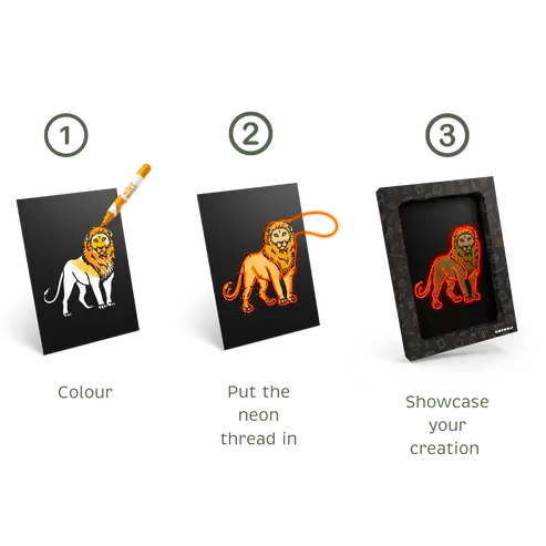 Con hilo con efecto neón insertado en un tablero pre-perforado, los niños pueden crear dibujos brillantes y originales que estarán orgullosos de mostrar.