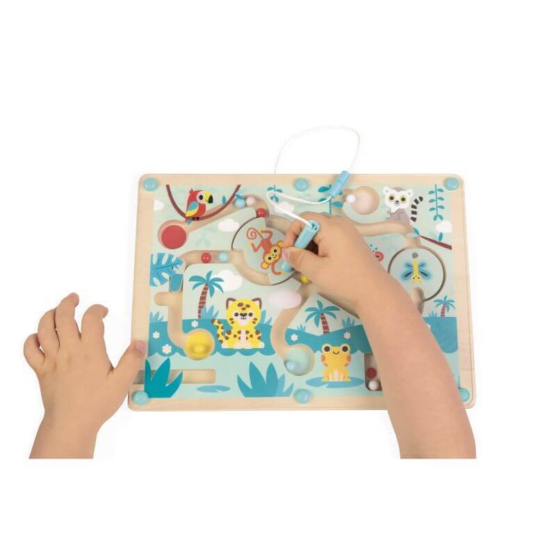Su hijo tendrá que atravesar el laberinto para repartir las 12 bolitas de colores a los animales correctos, usando el lápiz magnético.