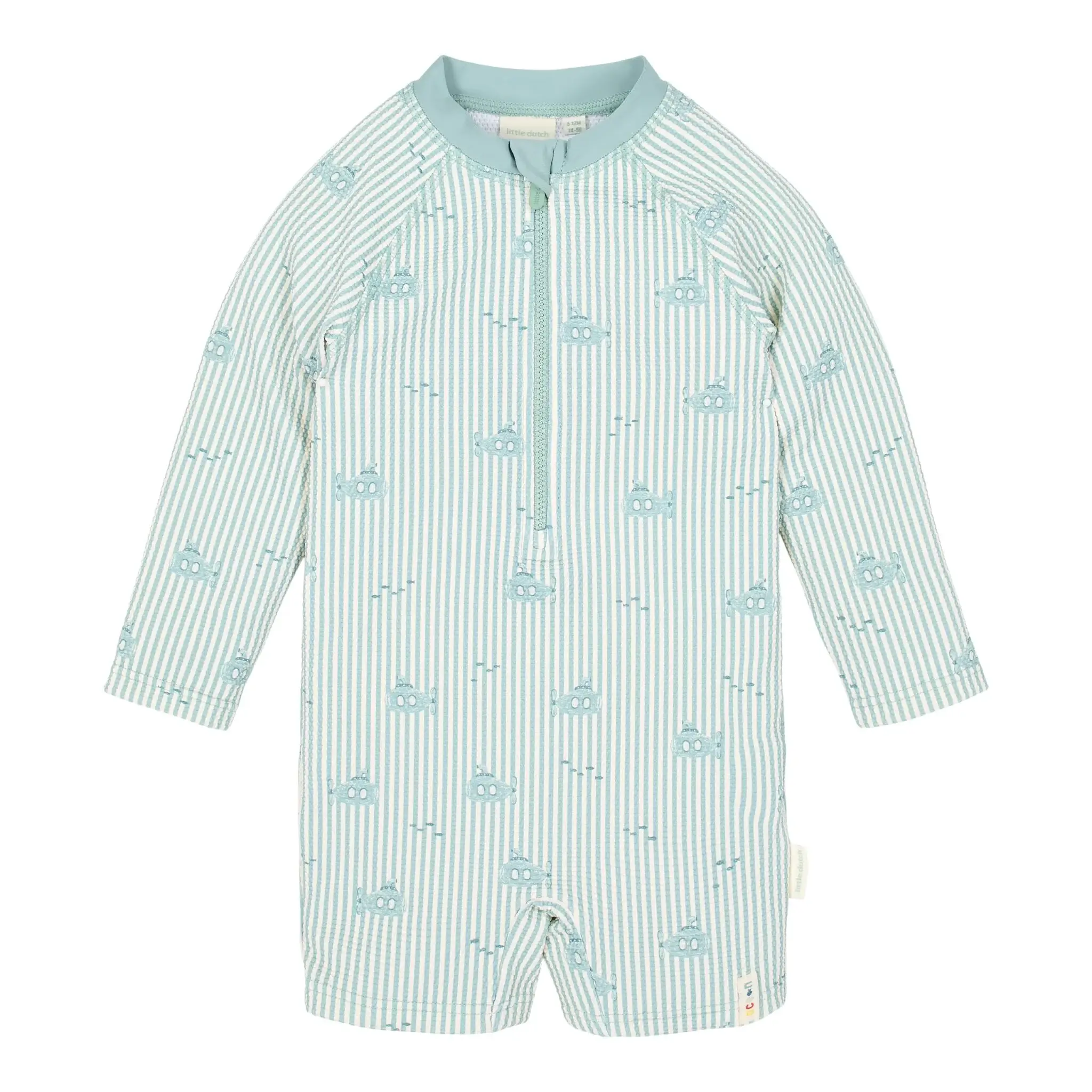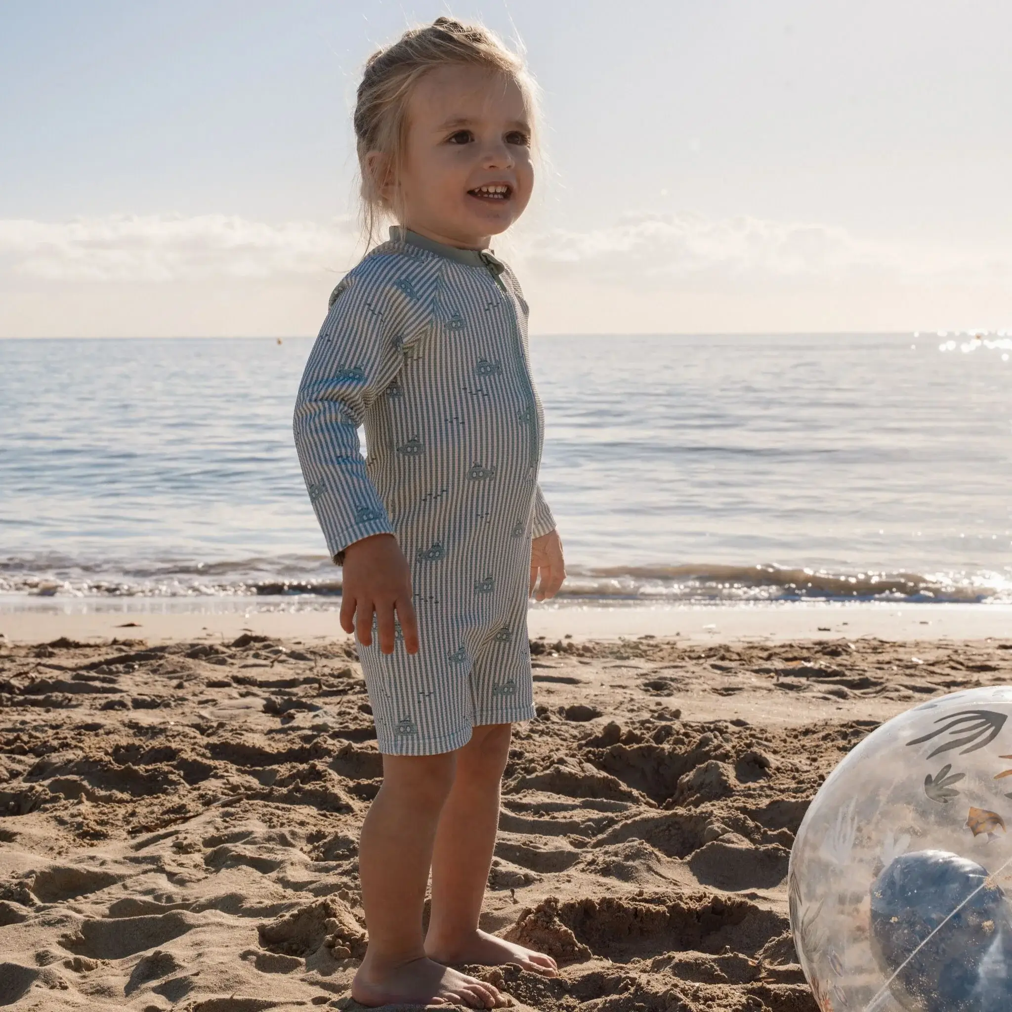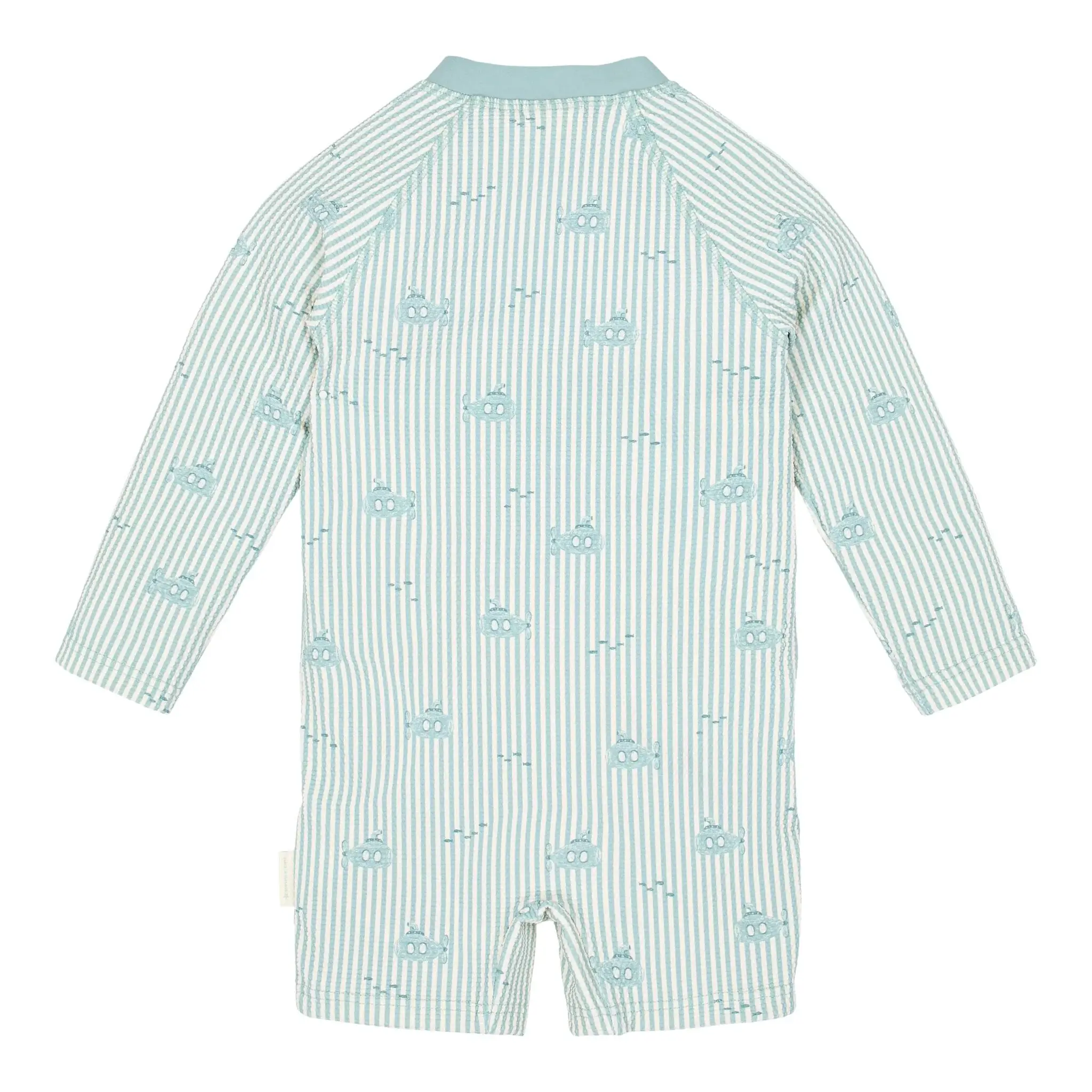 Este traje de baño de manga larga mantiene a tu pequeño abrigado en el agua y lo protege del sol.