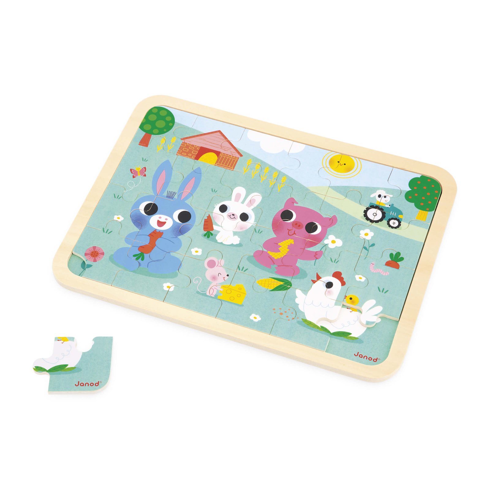 Este bonito puzle de madera compuesto por 24 piezas acompañará a su hijo en el descubrimiento de los animales de la granja.