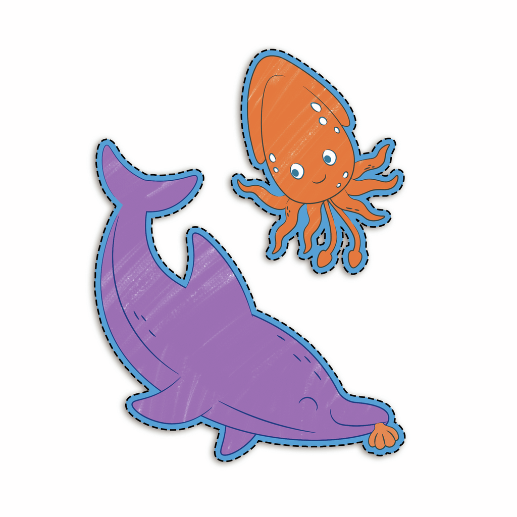 Los niños pueden dibujar coloridas criaturas marinas, arrancar secciones individuales siguiendo líneas fáciles de rasgar y recortar sus obras de arte para utilizarlas como pegatinas o piezas de exposición.