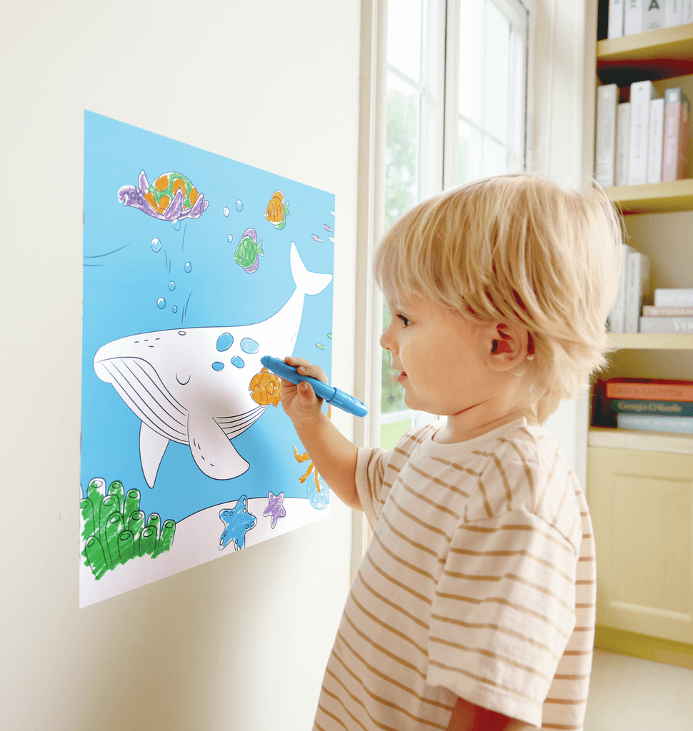 El rollo de papel para Garabatos Oceánicos ofrece más de 5 metros de juego creativo de temática marina, con cuatro ceras de colores suaves y un soporte adhesivo reposicionable.