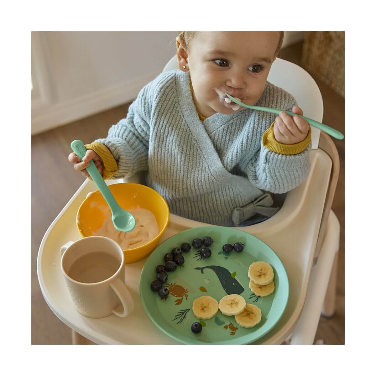 Con piezas adaptadas a sus manos y necesidades, favorece la independencia, la coordinación y la confianza durante las primeras comidas.